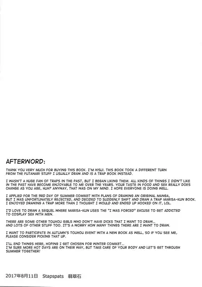 (C92) [Stapspats (Hisui)] Chorokawa Josou Danshi Marisa-kun o Gachihame Fuck de Mesu ni Choukyou Suru Hon (Touhou Project)